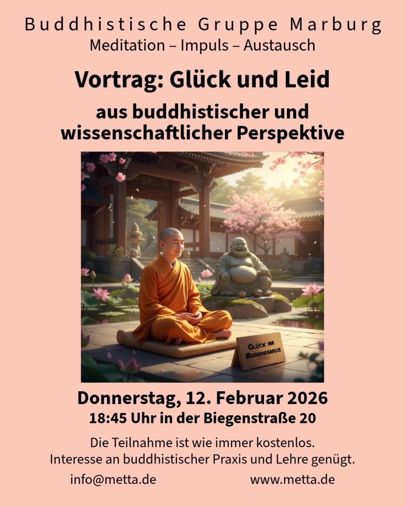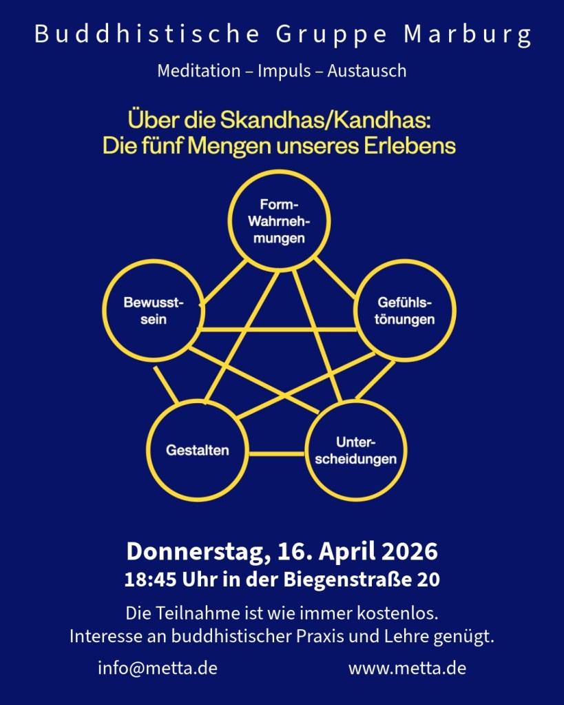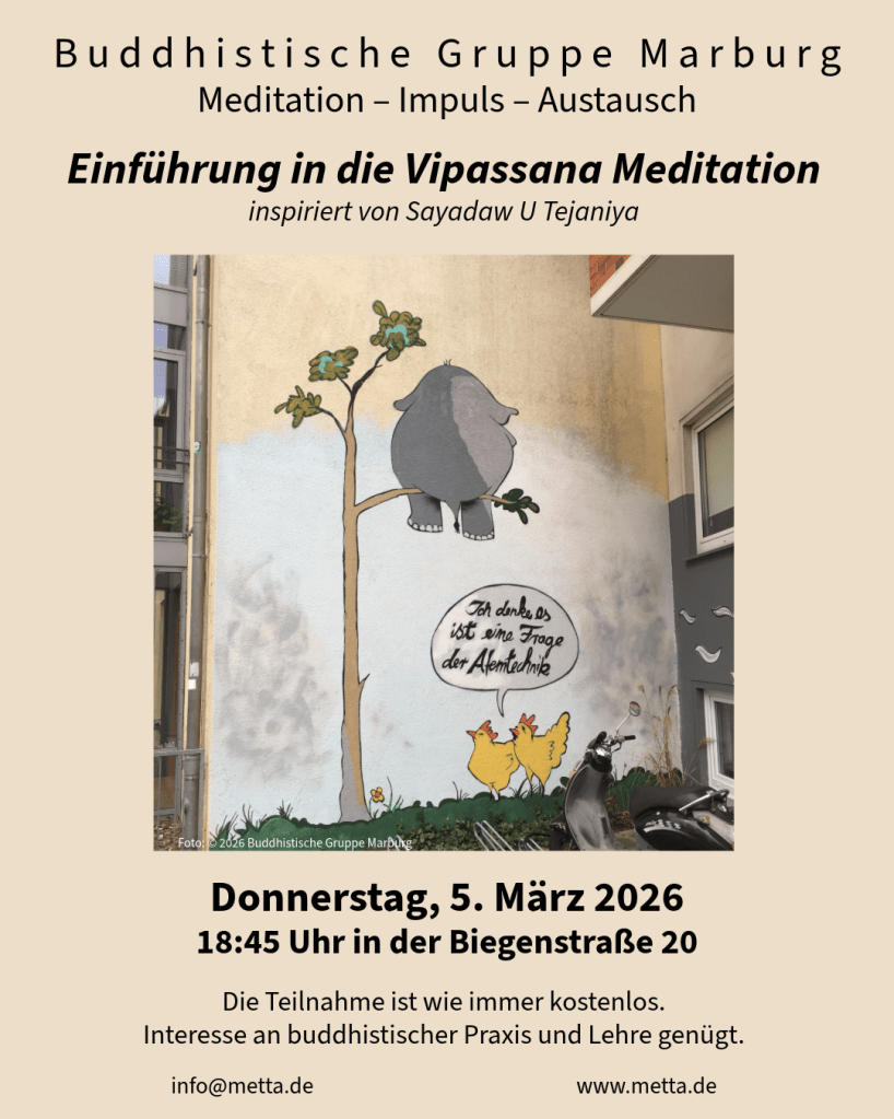 Jeweils donnerstags treffen wir uns um 18:45 Uhr zur gemeinsamen Meditation. Anschließend gibt es einen vorbereiteten Vortrag zu einem buddhistischen Thema, eine Lesung oder einen Videovortrag einer auswärtigen Lehrerin oder eines Lehrers. Die Teilnahme an Vortrag und anschließendem Austausch ist natürlich nicht verpflichtend.