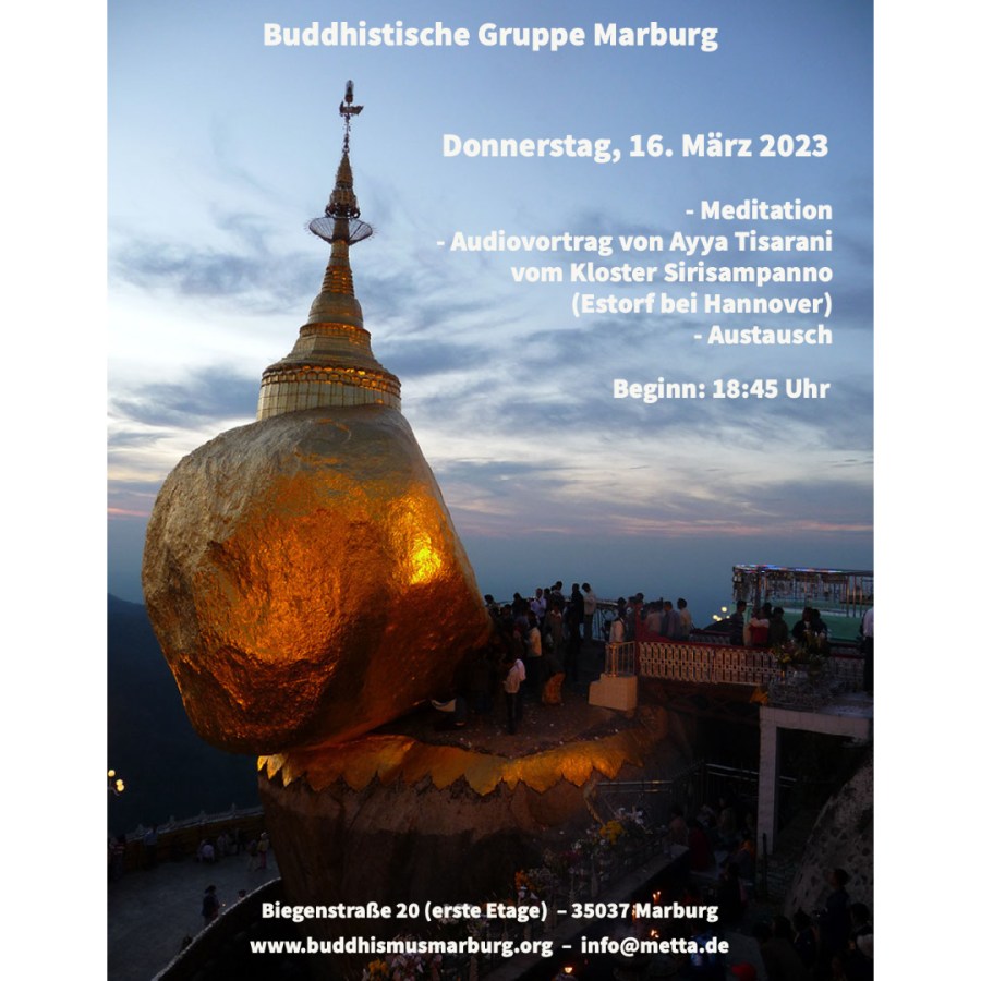 - Nach der Meditation werden wir einen Dhammatalk von Ayya Tisarani aus dem Theravada-Nonnenkloster Sirisampanna in Estorf bei Hannover hören. Ayya zeichnet sich durch ihre besonders warmherzige und von tiefem Mitgefühl getragene Art aus.