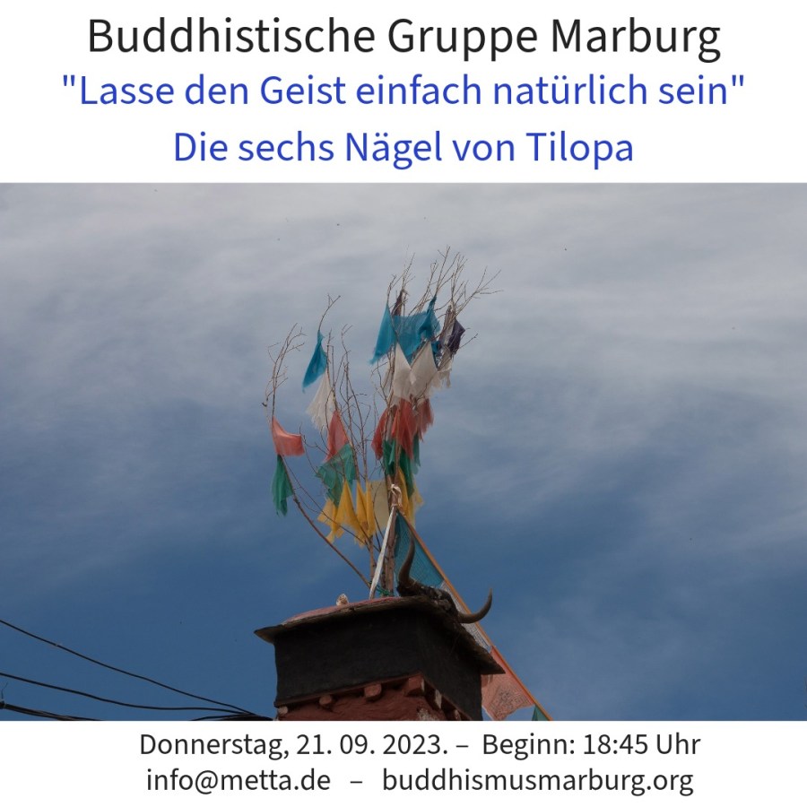 Das Kurzskript für diesen Abend mit einem ganz kurzen Abriss von Tilopas Leben und den sechs Nägeln kann heruntergeladen werden, ebenso die überarbeitete und ergänzte Fassung des Dhammatalks.