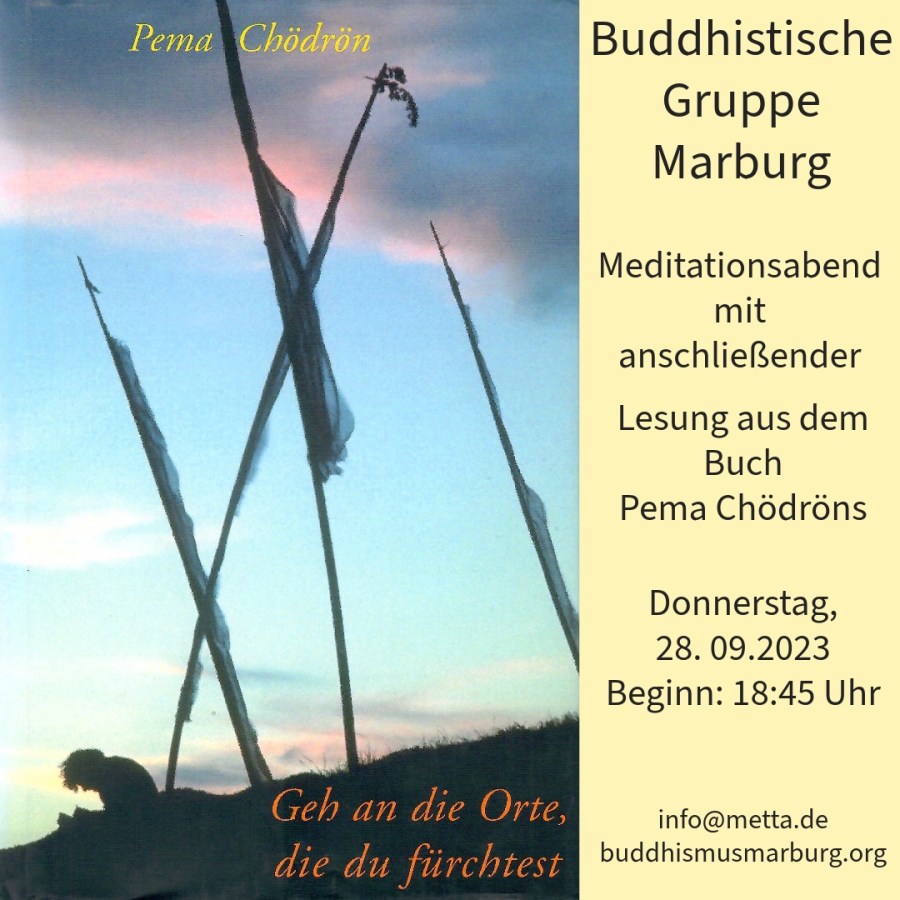 - Lesung: „Geh an die Orte, die du fürchtest“ lautet der Ratschlag von Pema Chödrön, einer bekannten Lehrerin aus der tibetischen Tradition. Der Schwerpunkt wird ein Abschnitt aus dem gleichnamigen Buch sein, der sich mit den emotionalen und mentalen Drangsalen beschäftigt, mit denen es einen klugen Umgang zu finden gilt. Anschließend gibt es Gelegenheit, das Gehörte mit eigenen Erfahrungen zu verknüpfen und miteinander zu teilen.