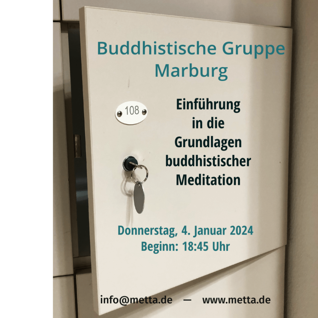 Wer schon Erfahrung mit der Sitzmeditation hat, ist eingeladen, bereits von 17:30 Uhr (s. t.)bis 18:30 Uhr an der Meditation teilzunehmen.