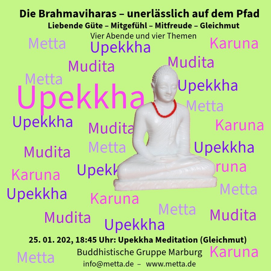 Am 25. Januar starten wir mit „Upekkha“, Gleichmut. Obwohl Gleichmut in den Aufzählungen am Ende steht, ist er doch eine wichtige Voraussetzung, um die anderen zu kultivieren.