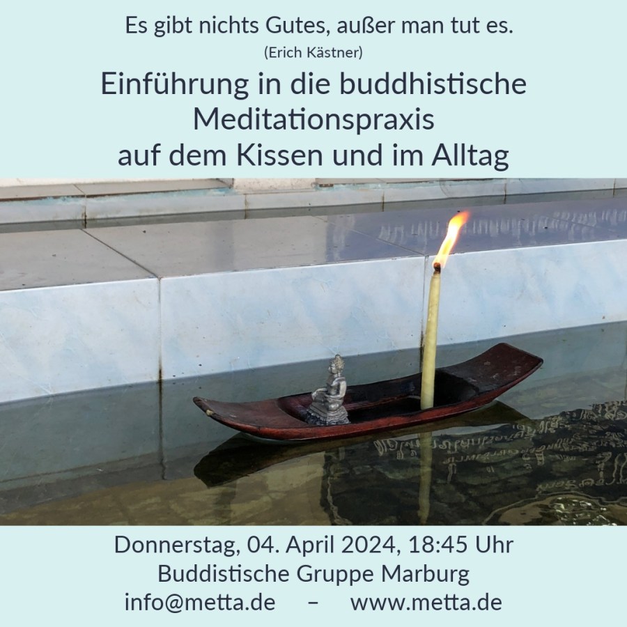 Wie an jedem ersten Donnerstag wird es heute um die Grundlagen dieser Meditationspraxis gehen, es sollte aber auch Raum geben für ein Gespräch darüber, wie wir diese in unser tägliches Leben integrieren können.