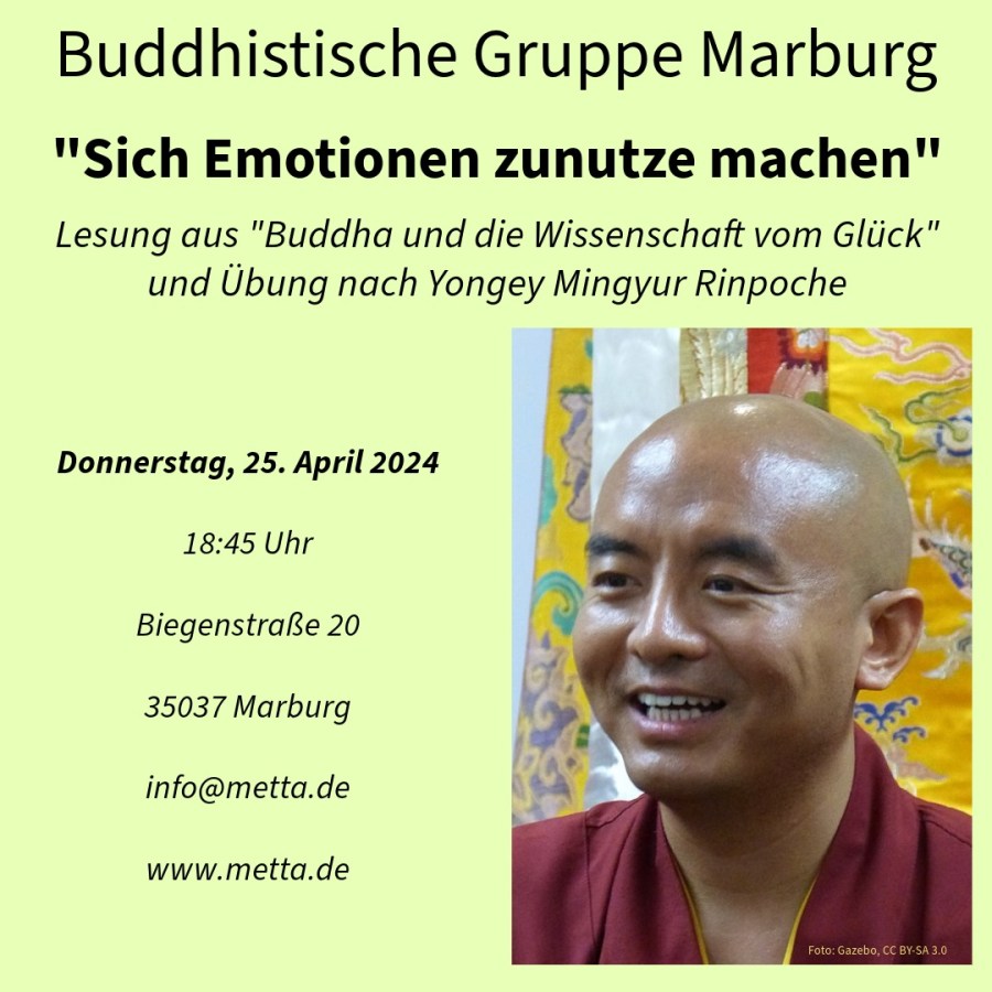 Mingyur Rinpoche erläutert in seinem Buch „Buddha und die Wissenschaft vom Glück“ wie eine Meditation funktioniert, die den Geist auf die Erfahrung von Gefühlsregungen richtet. Viele kennen die Meditation, bei der der Atem betrachtet wird. In der tibetischen und u. a. auch in der Vipassana Tradition kann das Feld des Gewahrseins auf die Erfahrungen, die wir mit unseren Emotionen machen, ausgeweitet werden.