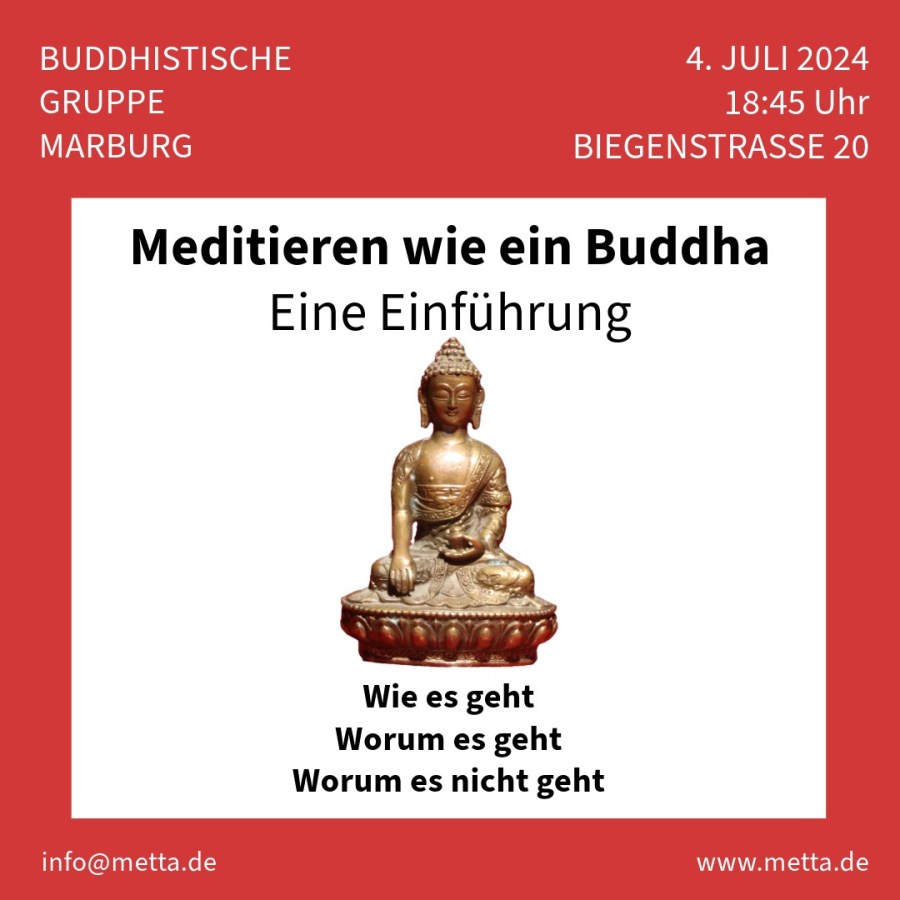 Wie stets am ersten Donnerstag im Monat geben wir eine Einführung in die grundlegende Meditationspraxis, wie Buddha sie gelehrt hat. Nach kurzen einführenden Worten über Sinn und Zweck dieser Form des Geistestrainings folgt eine Einführung in die Achtsamkeitsmeditation bei der wir die Aufmerksamkeit auf den Körper richten und üben, nicht gleich auf jeden Gedankenimpuls hereinzufallen.