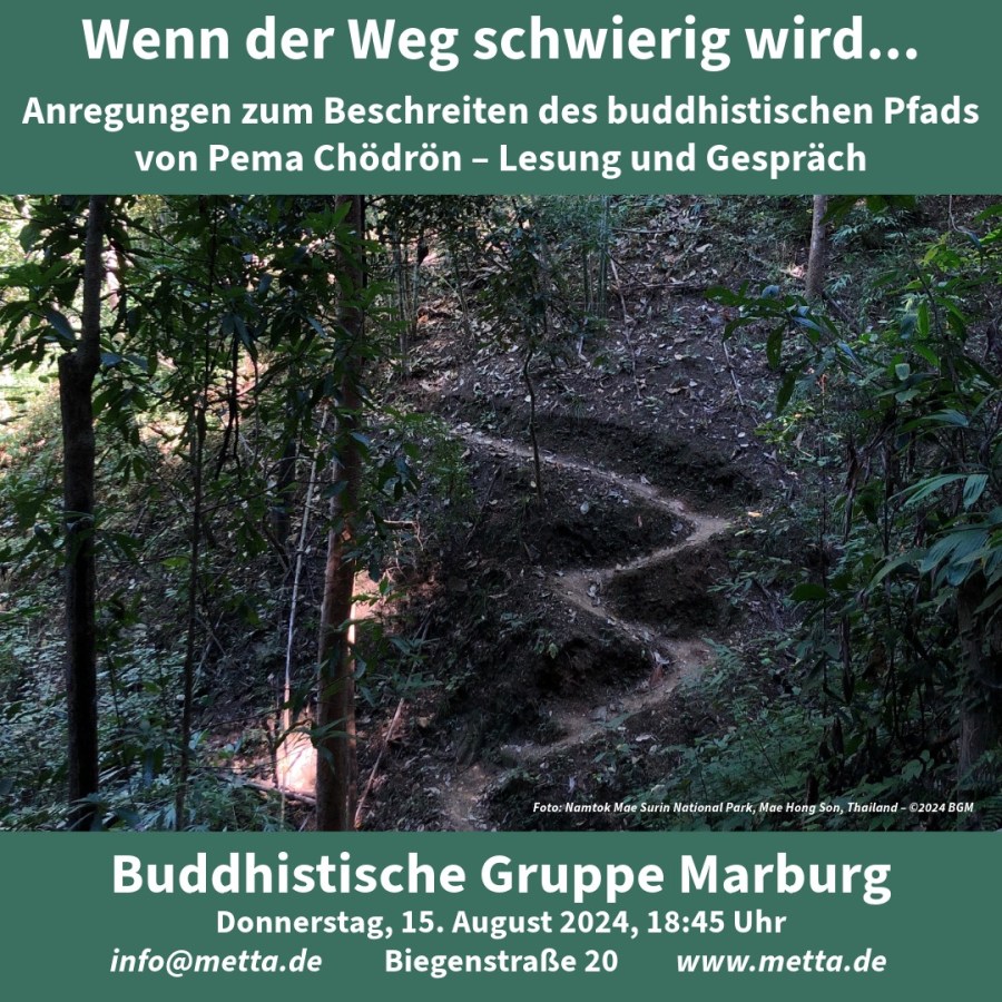 Ani Pema Chödrön, eine us-amerikanische Nonne aus der tibetischen Tradition, kennt dies aus ihrer jahrzehntelangen Praxis sehr genau. Wie man mit diesen Schwierigkeiten produktiv und sinnvoll umgeht, beschreibt sie in ihrem Buch „Geh an die Orte, die du fürchtest“. Daraus lesen wir ein kurzes Kapitel, um dann gemeinsam zu überlegen, wie es uns gelingen könnte, uns nicht immer wieder selbst vom Pfad abzubringen. Sie stellt diesem Kapitel ein Zitat Atishas (ein indischer Gelehrter des 11. Jhdts.) voran: „Laß dich von äußeren Umständen nicht vom Weg abbringen.“ Entscheidend ist schließlich, ob und wie wir auf äußere Umstände reagieren. Dies ist unsere Sache und nicht die einer anderen Person.