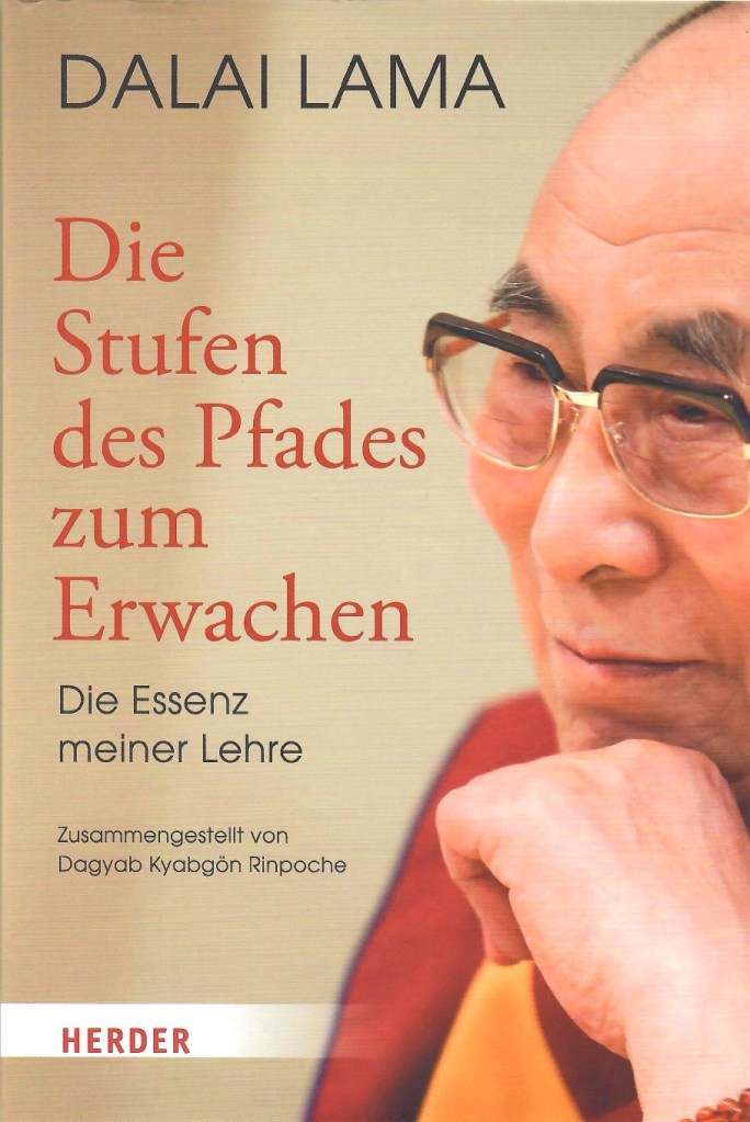 „Jedes Lebewesen wünscht sich ausschließlich Glück und keinerlei Leid. Daher besteht der Sinn und Zweck des Dharma darin, fehlerfrei aufzuzeigen, wie man sich die Ursachen für Glück – das Heilsame – aneignen und wie man die Ursachen für Leid – das Unheilsame – ablegen kann. Nur wenn wir uns von unserer Seite aus ernsthaft darum bemühen, kontinuierlich und mittels unterschiedlicher Methoden die heilsame Seite zu stärken – indem wir z. B. über Mitgefühl (karuna) und Vertrauen meditieren, aus den Schriften zitieren, logische Begründungen aufstellen sowie uns auf die [entsprechenden& Objekte konzentrieren –, können wir Schritt für Schritt solche Geisteshaltungen wie Mitgefühl in unserem Kontinuum erzeugen. Denn diese [Geisteshaltungen] entstehen nicht durch geringfügige Umstände, [ganz im Gegensatz zu den] ihnen entgegengesetzten Zuständen wie Ärger, anhaftende Begierde, Stolz oder Neid. Diese erfordern keinerlei Anstrengungen, sondern werden aufgrund von kleinlichen Umständen sofort stark auflodern, als würde man Öl als Brandbeschleuniger auf ein Feuer aus Gras und trockenem Holz gießen.“ – Tenzin Gyatso, der 14. Dalai Lama: Die Stufen des Pfades zum Erwachen. Die Essenz meiner Lehre. Herder, 2024, S. 146