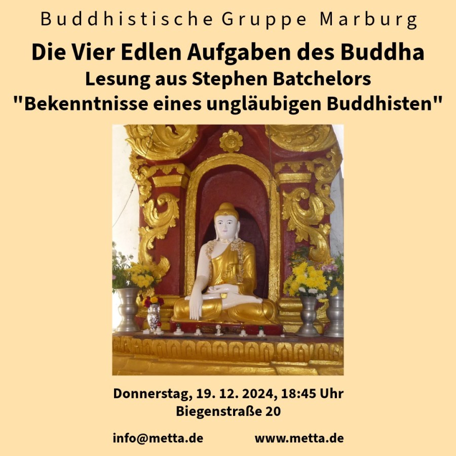 Lesung: Heute werden wir ein Kapitel aus „Bekenntnisse eines ungläubigen Buddhisten“ von Stephen Batchelor (Mitbegründer des Bodhi College) hören. Nach dem schönen Vortrag Theos letzte Woche über den edlen Achtfachen Pfad, schließt sich zum Jahresende noch etwas sehr Grundlegendes an. Im Kapitel „Das Leiden umarmen“ entwickelt Stephen eine interessante Sichtweise auf die vier edlen Wahrheiten Buddhas, die er als vier edle Aufgaben übersetzt und den edlen Achtfachen Pfad: