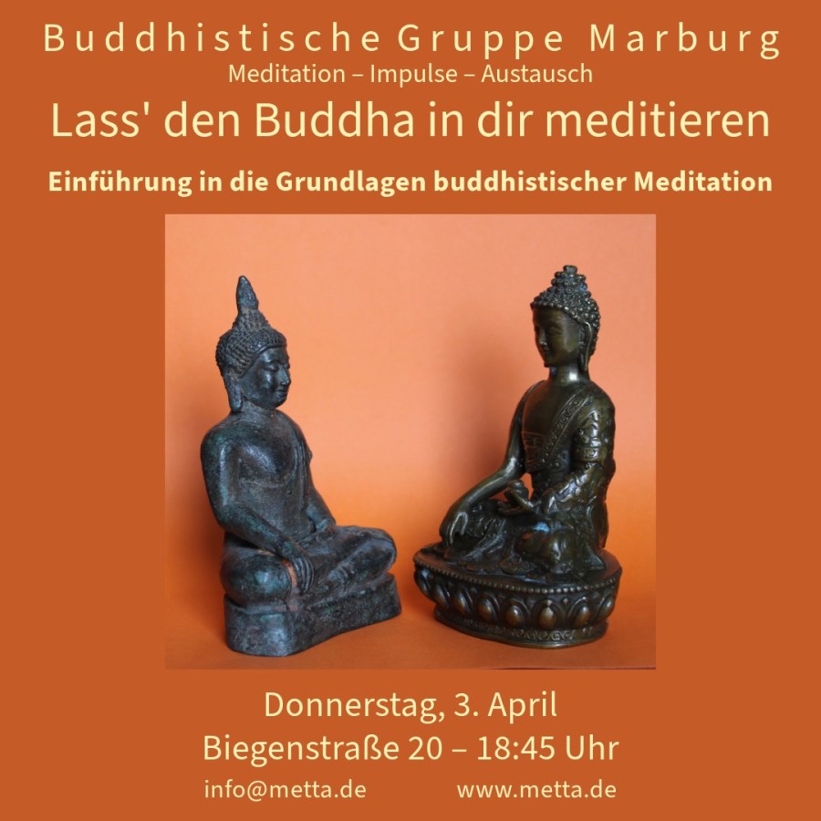 Nach einer kurzen Einführung in die Grundlagen der buddhistischen Achtsamkeitsmeditation üben wir diese in Form einer geleiteten Meditation. Es spielt keine Rolle, ob und wie viel Erfahrungen mitgebracht werden. Wir starten jedesmal ganz von vorn, mit dem ersten bewussten Atemzug, wenn wir mit der Praxis beginnen.