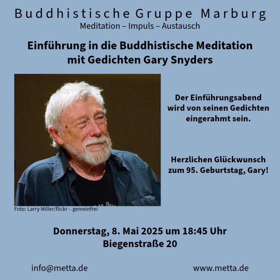 Zugleich ist der 8. Mai auch der 95. Geburtstag Gary Snyders, einem der bedeutendsten amerikanischen Lyriker, Friedensaktivisten, Mitbegründer der US-Umweltbewegung und last not least Zen-Praktizierenden. Er ist wohl der letzte Lebende aus der Gruppe der Beat Generation um Jack Kerouac, William S. Burroughs und Allen Ginsberg.
