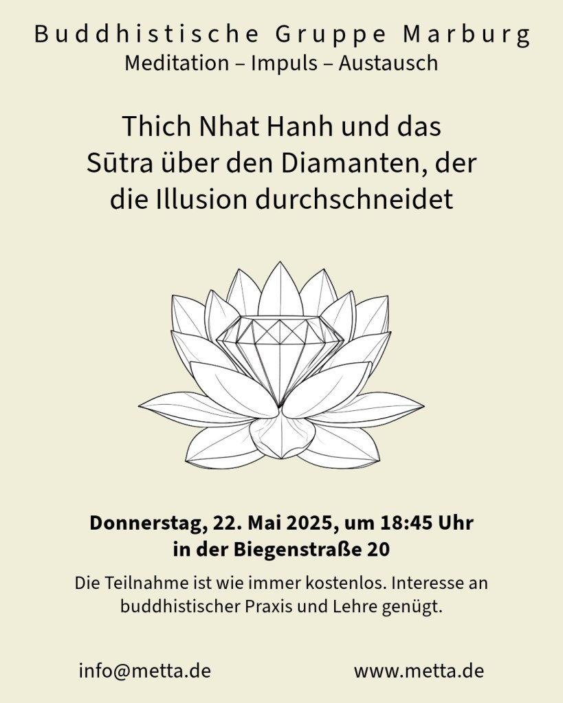 An diesem Abend werden wir uns nach der Meditation das Diamant-Sūtra in Form der Erläuterungen von Thich Hat Hanh anschauen.