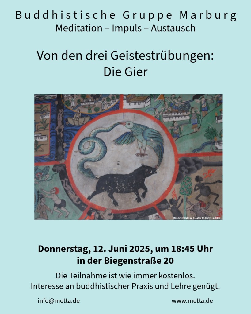 Es wird wieder reichlich Gelegenheit geben, über das Thema und die eigenen Erfahrungen mit Gier und Geiz sowie mit der Meditation, miteinander ins Gespräch zu kommen.