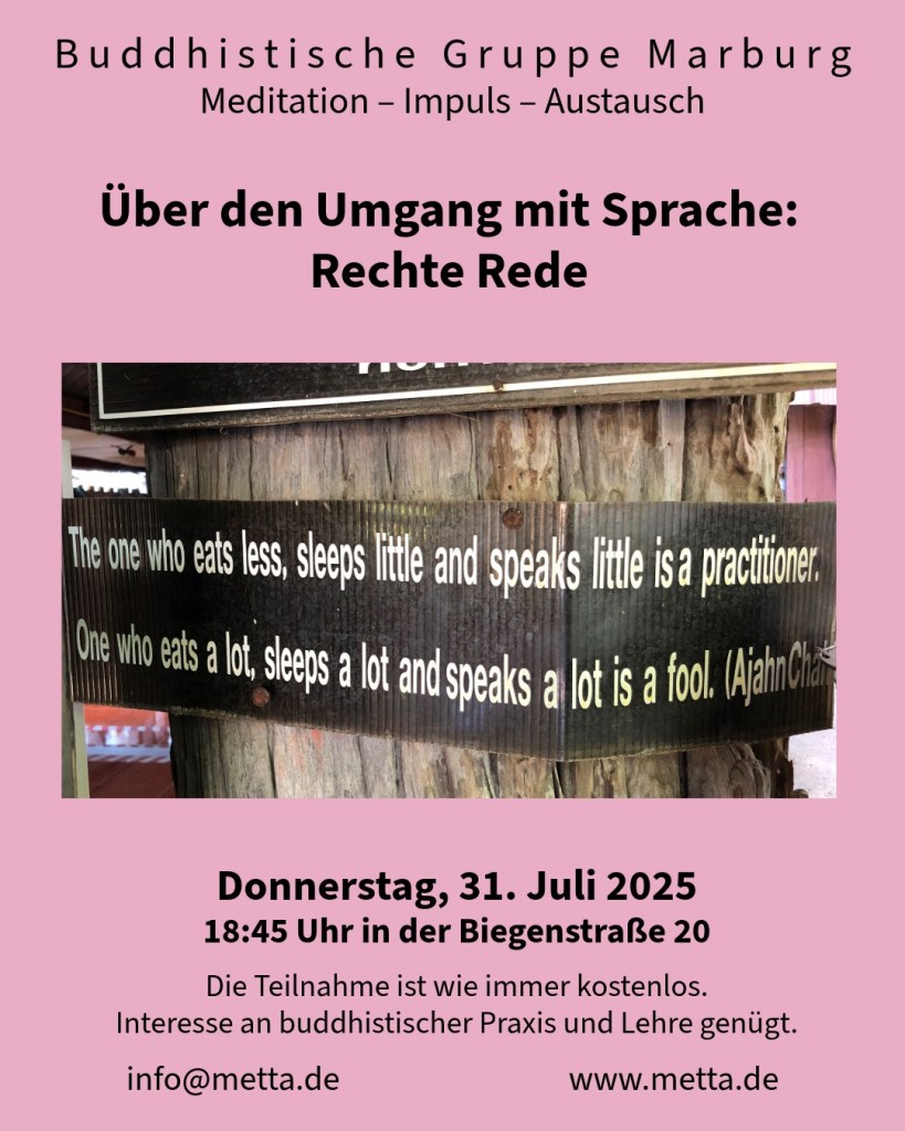 Oft haben wir donnerstags schon darüber gesprochen, wie wenig unsere Sprache dafür geeignet ist, innere Prozesse, komplexe Vorgänge und Emotionen auszudrücken. Gleichwohl sind wir auf verbale Kommunikation angewiesen und beherrschen diese oft recht ordentlich. Sprache hat Wirkungen im Inneren und Äußeren. Es kommt deshalb darauf an, mit welcher inneren Haltung wir miteinander ins Gespräch kommen. Der Buddha hat nicht ohne Grund angemessenes, rechtes, Sprechen in den edlen achtfachen Pfad aufgenommen, der zur Befreiung von Herz und Geist führt. Mit unseren Worten können wir uns selbst und andere verletzen, ob wir wollen oder nicht.