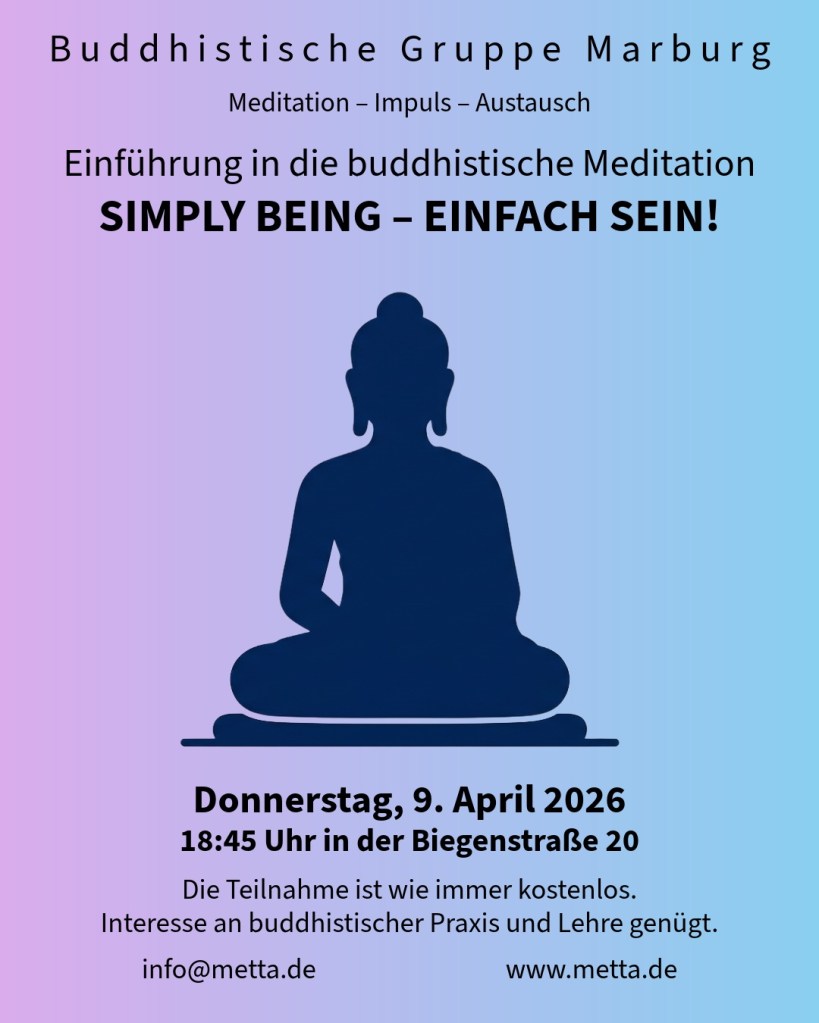Anstatt am ersten Donnerstag eines Monats gibt es diesmal am zweiten eine Einführung in eine der buddhistischen Meditationstechniken in Form einer geleiteten Meditation.