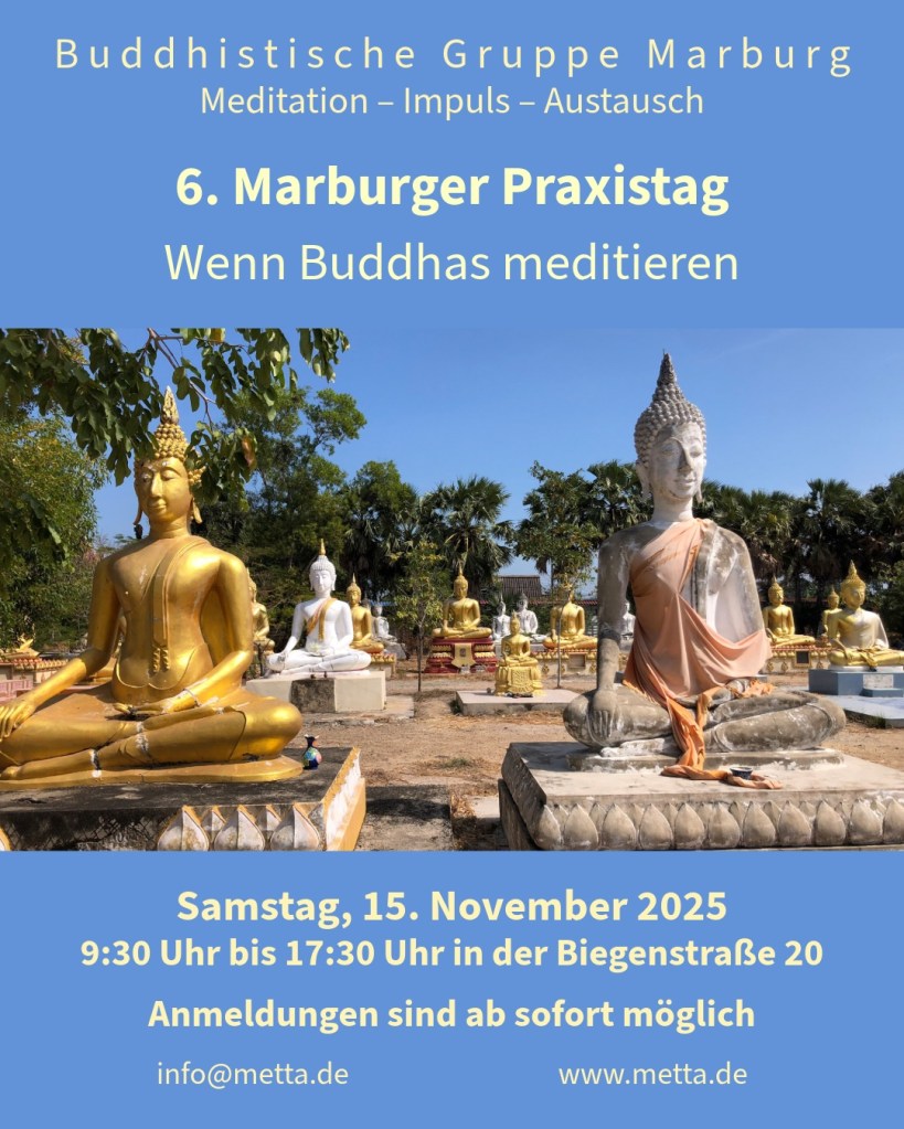 Eine gute Gelegenheit, heilsame Ursachen für heilsame Wirkungen zu schaffen, ist wie immer unser gemeinsamer Praxistag, an dem wir einen Tag lang (na gut, nicht ganz: von 9:30 bis 17:30) Achtsamkeit und Gewahrsein kultivieren. Inzwischen hat sich Andrea wieder bereiterklärt, ihre kulinarischen Kenntnisse in den Dienst unseres Pfades zum Erwachens zu stellen. Das Mittagessen ist nunmehr gesichert. Jet zt kommt es nur noch auf euch an.