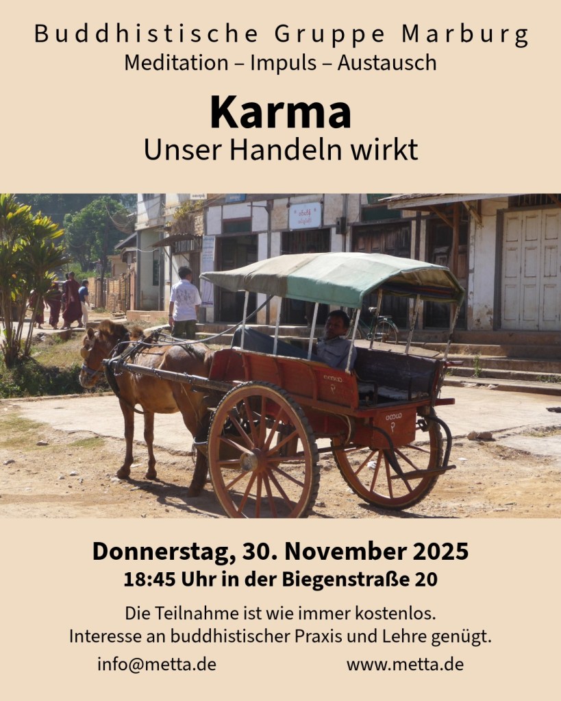 An diesem Abend wollen wir versuchen, etwas Licht ins Karma zu bringen. Sicher scheint, dass Gotama (Buddha) wohl recht hatte, als er laut dem Dhammapada sagte: