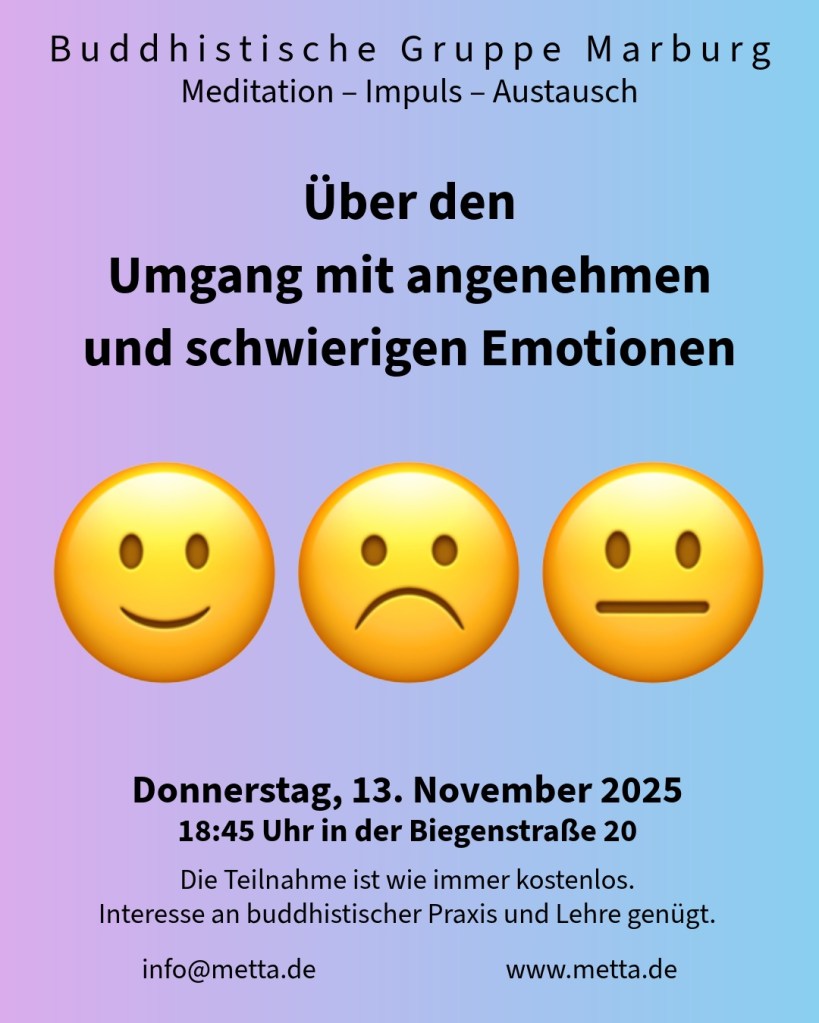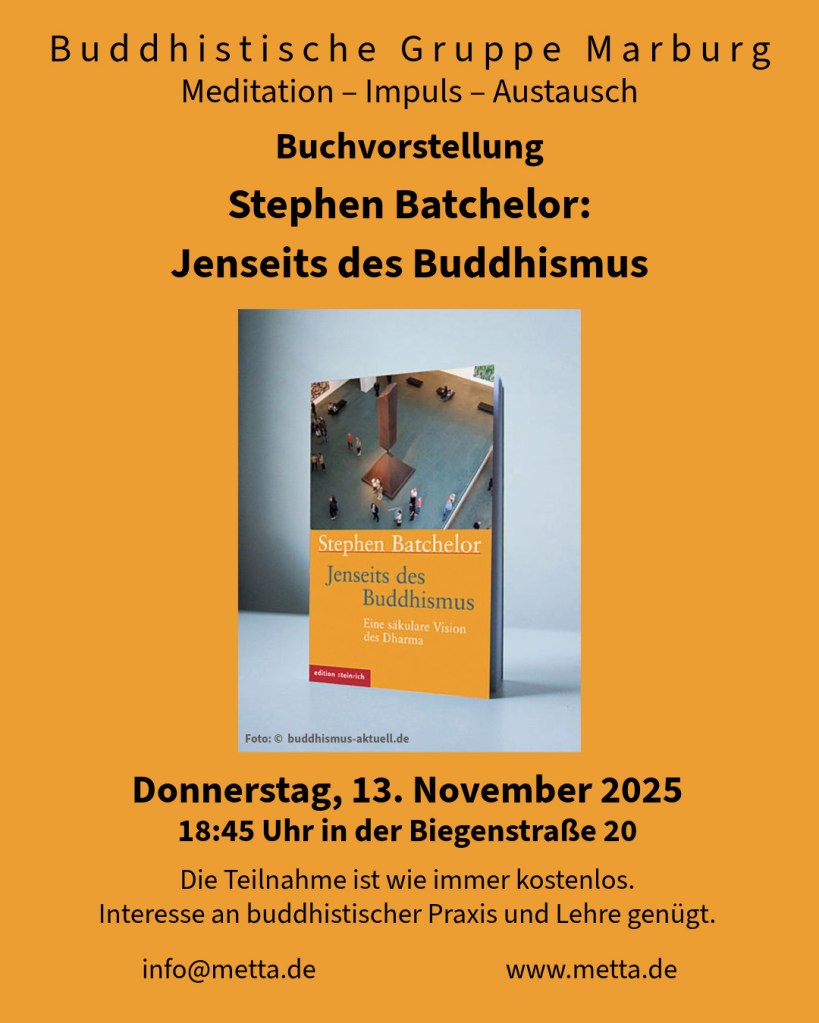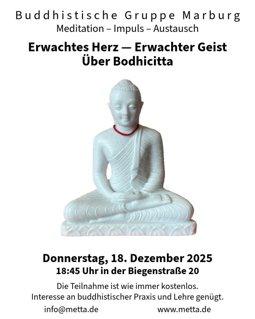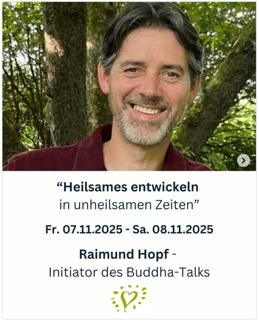 Der einigen von uns bereits bekannte und geschätzte Meditationslehrer Raimund Hopf (Mitbegründer des „Buddha Talks“ und der Hilfsorganisation „Mitgefühl in Aktion“) hält am Freitag, 6. 11. 2025 um 19:00 Uhr im Buddhistischen Stadtzentrum Hamburg einen Vortrag mit anschließendem Übungstag. Thema ist „Heilsames entwickeln in unheilsamen Zeiten – Buddhistische Tugenden für den Alltag“, was sehr gut zu unserem nächsten Thema passt. Eine Onlineteilnahme ist für Vortrag und Übungstag möglich.