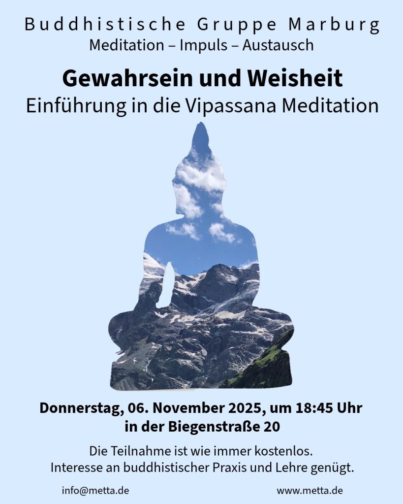 Wir beginnen um 18:45 Uhr mit einer Meditation im Sitzen und Gehen (ca. 20 – 10 – 20 Min.).