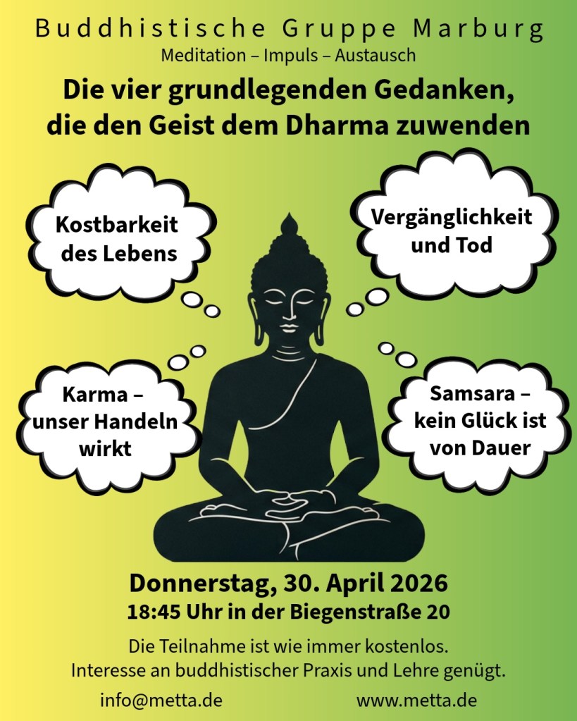 Anschließend an das bewegende Gespräch in der letzten Woche soll es nach der Meditation um die vier Gedanken gehen, die den Geist dem Dharma zuwenden.