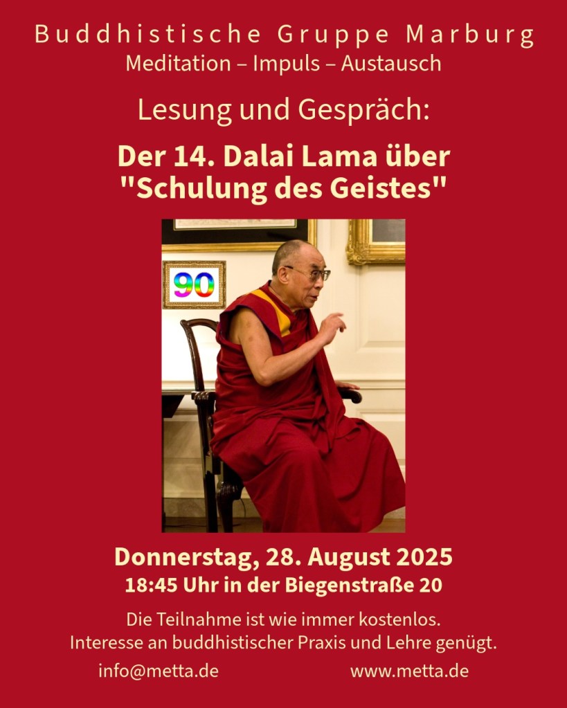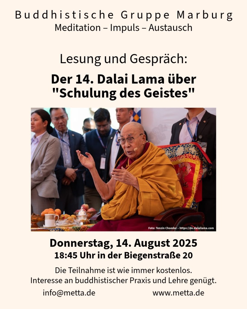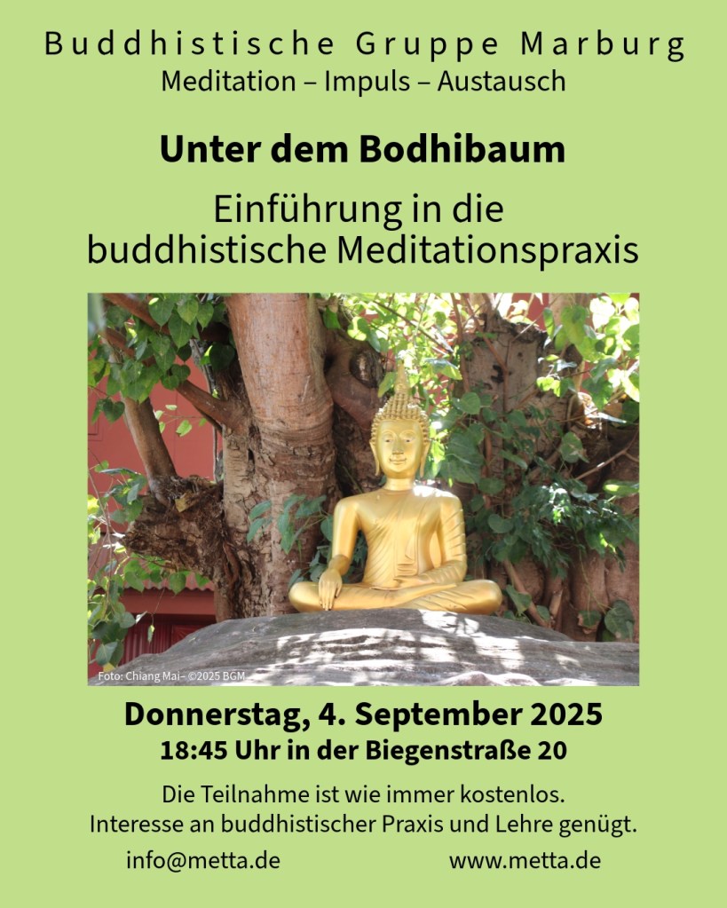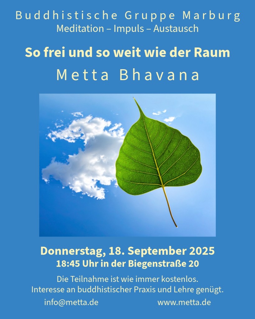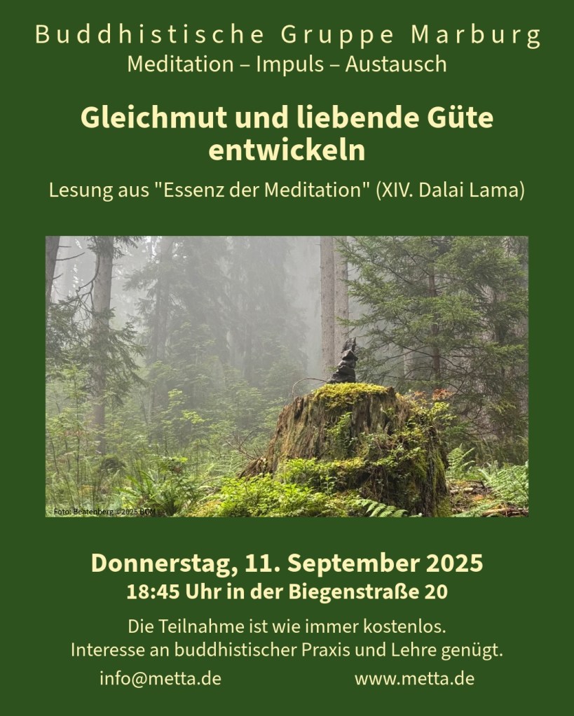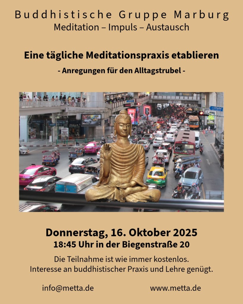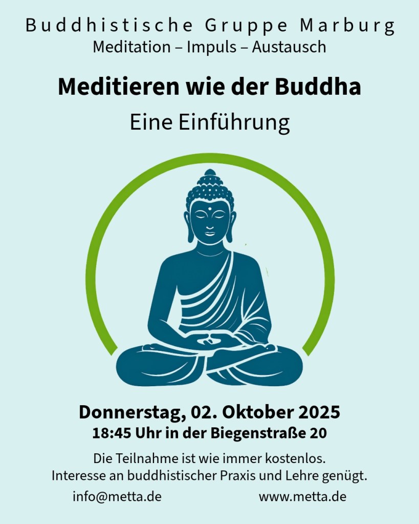 Es wird wieder reichlich Gelegenheit geben, über das Thema und die eigenen Erfahrungen mit der Meditation, schöne wie auch schwierige, miteinander ins Gespräch zu kommen.