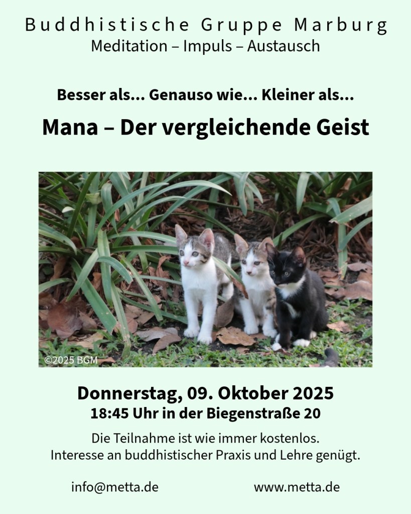 Der Vortrag der letzten Woche beruhte auf einem Text Fred von Allmens. Wer sich noch einmal in Ruhe mit Mana – Dünkel oder dem vergleichenden Geist beschäftigen möchte, findet Freds Vortrag auf seiner Homepage. Fred, wie auch die meisten anderen Lehrerinnen und Lehrer leben vollständig von unserer Großzügigkeit, dana. Deshalb sollte beim Herunterladen eine Spende erwogen werden. Nur so kann das Prinzip, dass buddhistische Unterweisungen kostenlos angeboten werden, aufrechterhalten werden. Alles dazu Notwendige findet sich hier.