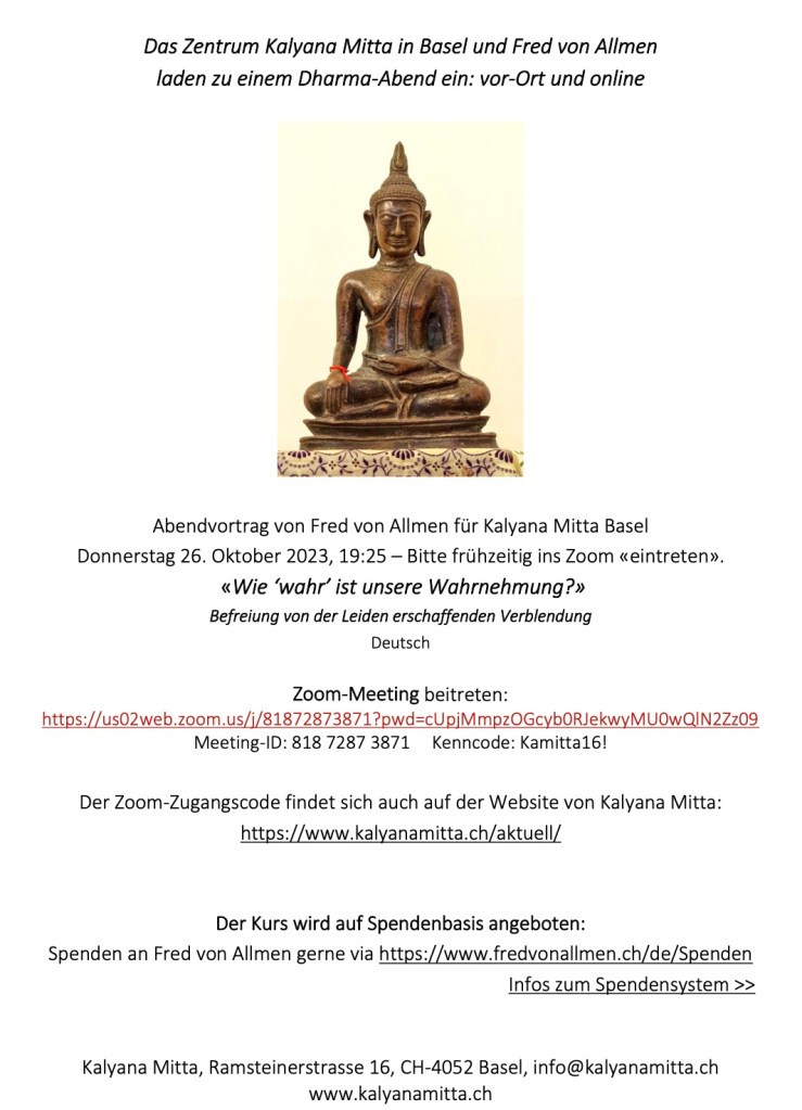 Die Treffen finden jeweils Samstags am Nachmittag von 17:00 bis 19:00 Uhr statt. Beginn wird am 27. September sein. Mit dabei sein werden u. a. Yuka Nakamura, Akincano Weber, Gerit Stöcklmair und Christoph Köck. Allesamt profilierte Lehrer und Lehrerinnen des säkular ausgerichteten, von Stephen Batchelor mitgegründeten, Bodhi College.