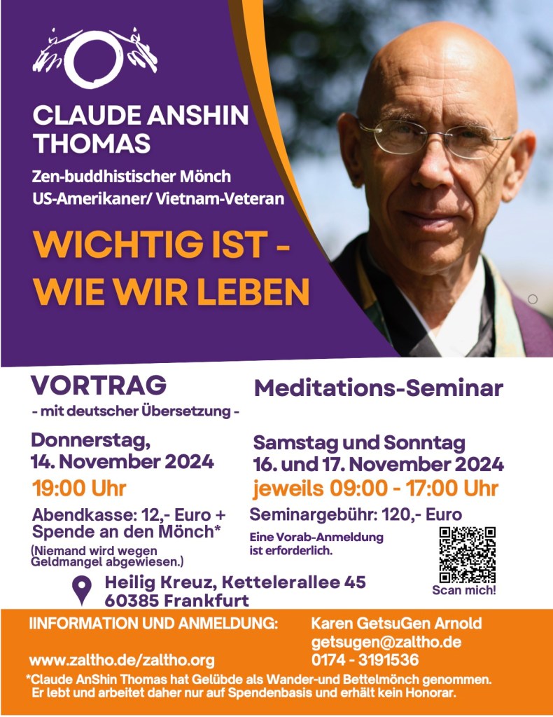 Claude AnShin Thomas, ein bekannter Zen-Wandermönch wird im November 2024 in Frankfurt/Main einen Vortrag geben und ein Meditationsseminar leiten. Nähere Infos auf der Homepage des Zaltho Sangha.