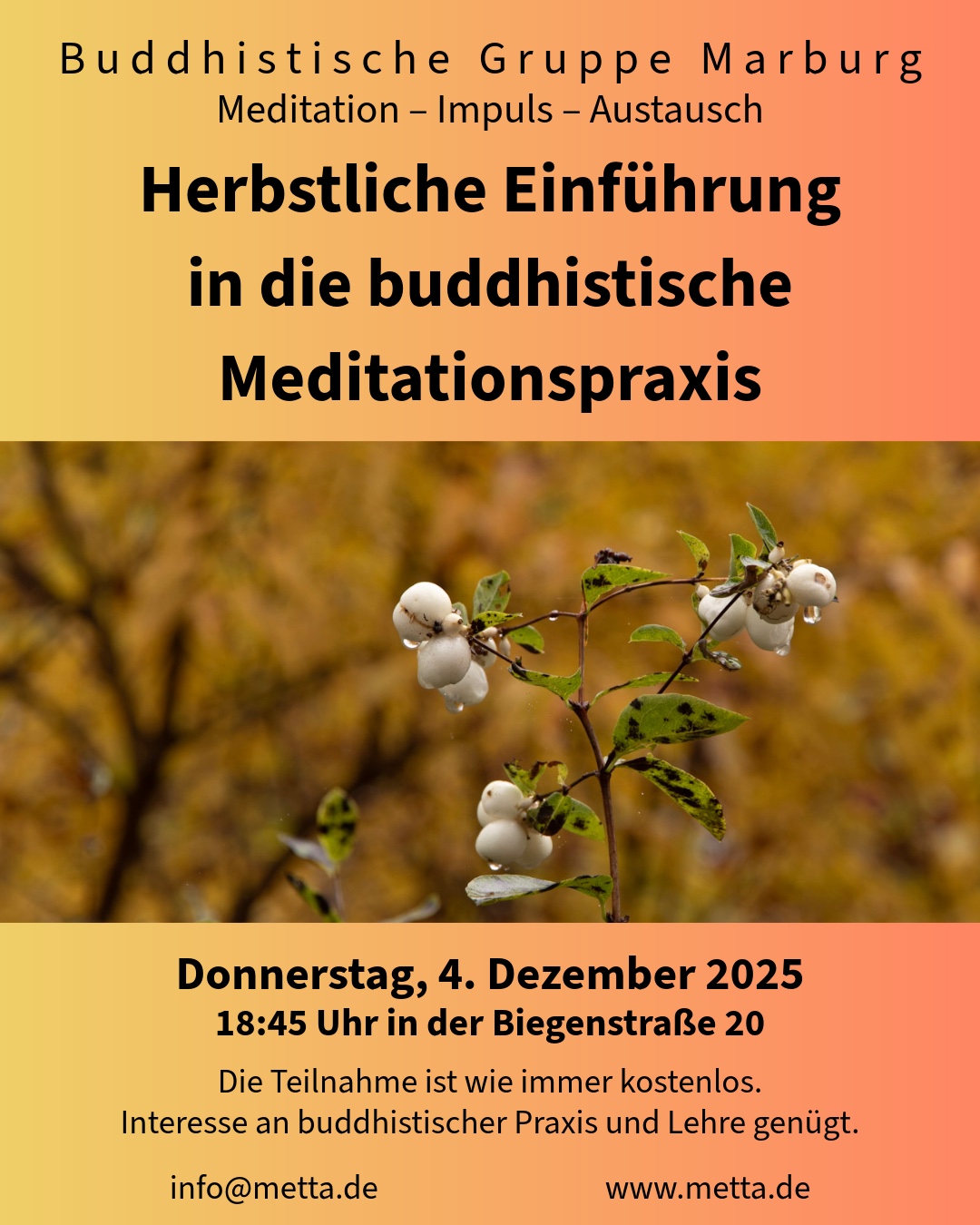Mitfahrgelegenheit besteht diesmal nicht, eine gemeinsame Bahnfahrt für Interessenten aus dem Marburger Raum ließe sich organisieren. Nachricht genügt an info(at)metta.de.