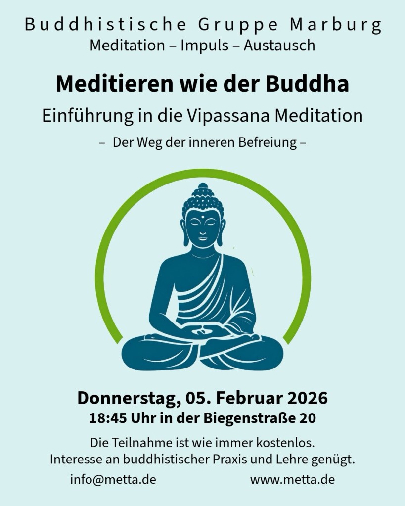„Gedanken über Metta“ (zum Metta-Abend am 15. Februar 2024) mit einigen Zitaten berühmter Meditierer und einer Übersetzung der Metta-Sutta nach Thich Nhat Hanh sowie Śantidevas Bodhisattva-Versprechen liegen zum Download bereit, können aber auch in ausgedruckter Form donnerstags nach der Meditation mitgenommen werden.